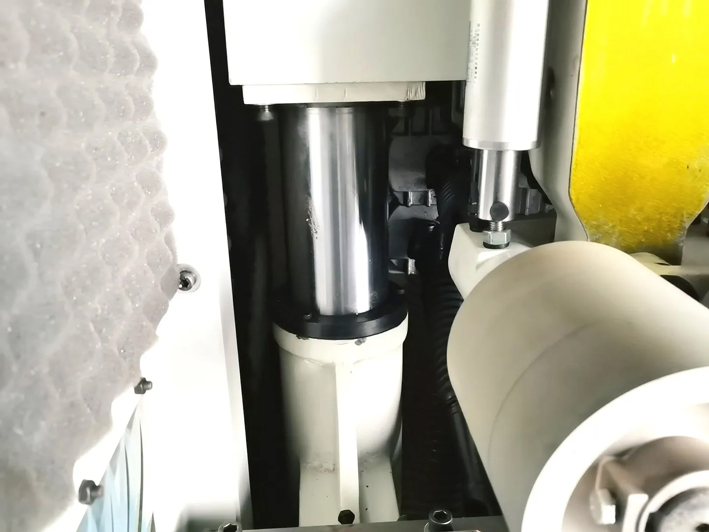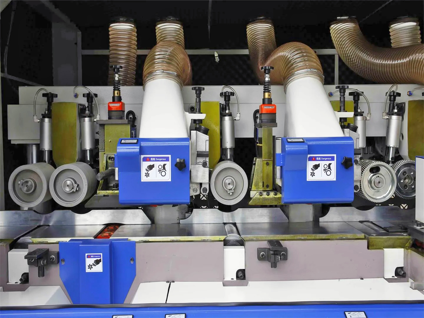 Пневматическим прижимом оснащены не только подающие ролики, но и прижимные «утюжки» на верхних шпинделях, что гарантирует надежный прижим и отсутствие вибрации в зоне реза. |
