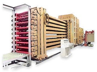 Автоматическая система горячего прессования для LVL бруса FA 12000 (опция - 18 м) оснащена формирующими конвейерами для шпона, системой загрузки, системой выгрузки и гидравлическим столом. Технология изготовления данного изделия представляет собой склейку древесного шпона с толщиной не более 3 мм, который слоями выкладывается на специальный пресс.