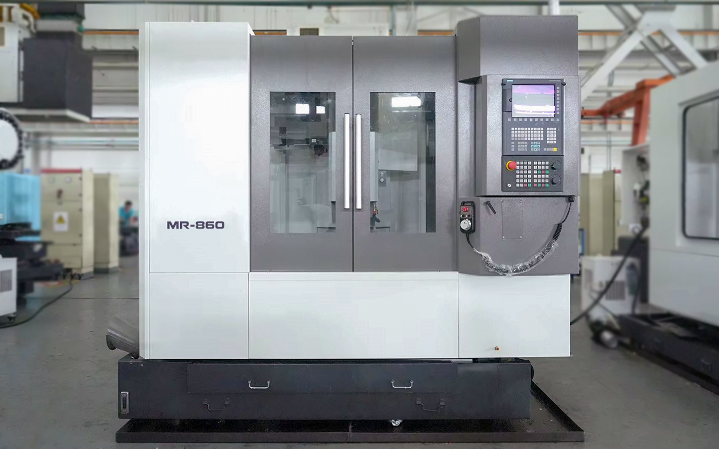 Фрезерные обрабатывающие центры STEELMAC модели МR-860 предназначены для высокотехнологичной фрезерной обработки с высокой точностью ±0,004 мм. Сочетание высокой жесткости виброустойчивой конструкции станины с усиленными ребрами жёсткости, мощного привода шпинделя до 11/15 кВт и высокоточных направляющих увеличенного сечения, позволяют успешно сочетать жёсткое и силовое точение с чистовой обработкой деталей в закалённом состоянии с твердостью до 63 HRC, при этом обеспечивая точность по 6 - 7 квалитету и шероховатость по 8 - 9 классу.
